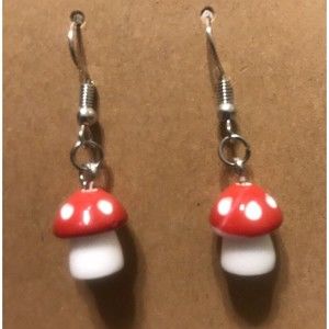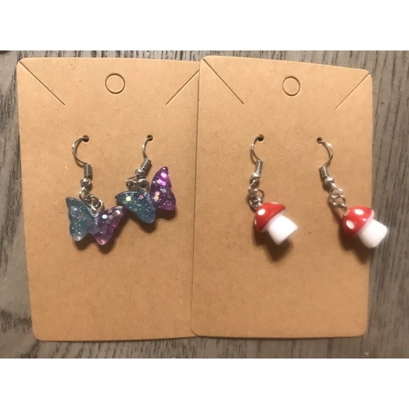 Set Of 2 Pairs Silver Earrings USA HANDMADE Resin Glitter Butterfly Blue Purple and Red and White Mushroom Earrings