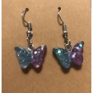 Set Of 2 Pairs Silver Earrings USA HANDMADE Resin Glitter Butterfly Blue Purple