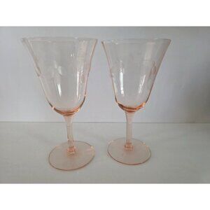 Set Of 2 Pink Etched Depression Floral Wine Glasses
