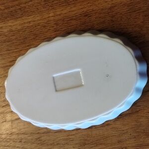 Set of 2 oval ramekins with blue and yellow floral design and fluted edges. New condition, unused. Approximately 8 inches x 5¼ inches x 1½ inches.
