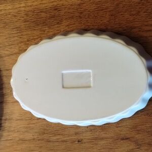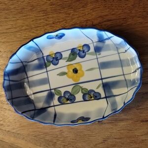 Set of 2 oval ramekins with blue and yellow floral design and fluted edges. New condition, unused. Approximately 8 inches x 5¼ inches x 1½ inches.