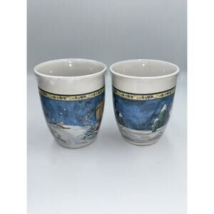 One mug has St. Nicholas with birds and the second shows him hiking to deliver gifts, both with outdoor backgrounds of winter landscapes.