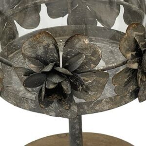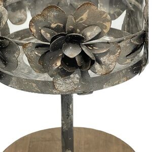 Set Of 2 Shabby Chic Galvanized Metal Rose Hurricane Glass & Wood Candle Holders