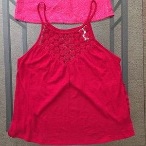 Both Tanks Are Sz Small~ Top Pink Tank Is A Rue 21 Brand & Is Filled w/ Sparkly Sequins, & Is In Like New Condition~ 2nd Red Tank Is Arizona Brand w/ Lovely Crochet Detail On Front Of Tank & Also On The Back Of The Tank, Has A Slit Up The Lower Back, Done Up In Crochet Detail~ In New, Very Good Condition~ Both Tops My Daughter Either Never Wore or Only Once~No Stains, No Flaws*I've Set Price to be Fair, Firm & Affordable**Thank You...