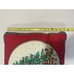 Set of two matching throw pillows in nice vintage condition. Features beautiful picture of toys beneath a decorated Christmas tree. Slight discoloration/yellowing to white/cream fabric from age. Overall in good condition for their age.