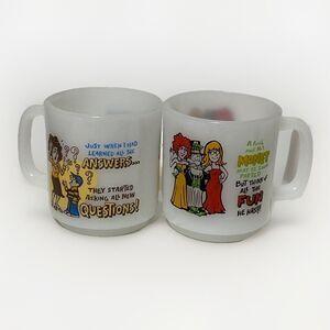 This set of 2 vintage Glasbake milk glass coffee tea mugs features a humorous graphic of cartoons, making it a fun addition to any kitchen or collector's display. With a capacity of 10 oz, these mugs are perfect for all occasions and are made of durable glass. Manufactured in the United States during the 1980s, these retro style mugs capture the nostalgia and humor of that era, making them a unique and quirky choice for coffee or tea enthusiasts.
