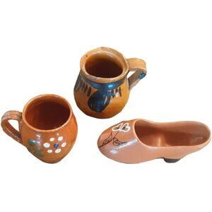 Set Of 3 Dominican Republic Terracotta Clay Pottery. Handmade Shoe Mugs