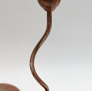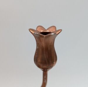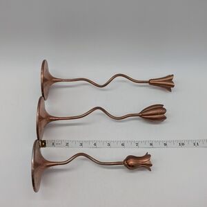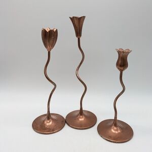 Set Of 3 Flower Mini Candlestick Holders. These do not hold regular size candlesticks. They have severe scuffing/scratches and need to be refinished (see all photos). Currently a pink/bronze color.