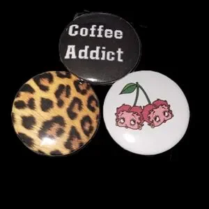 Add flair to your outfit with this stylish pinback button set. Featuring a bold leopard print and a cute cherry design, these brooches are perfect to match with any of your bags.