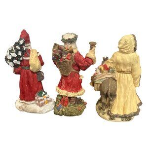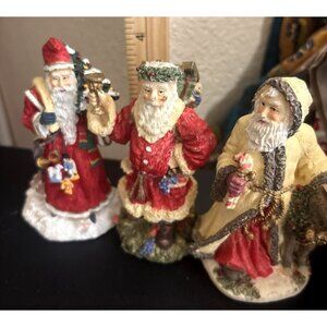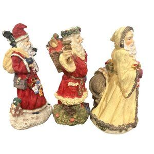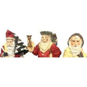 These hand-painted resin Santa Claus figurines exhibit vintage-inspired charm, detailed craftsmanship, and festive holiday accents. Ideal for seasonal decor or gifting.