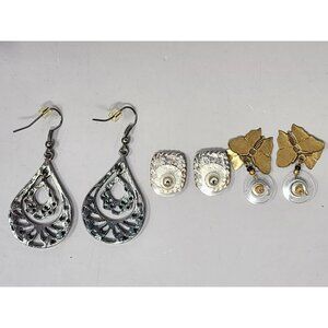 Set Of 3 Pairs Of Earrings: Silver Tone Teardrop Green Stud Gold Butterfly Desig
