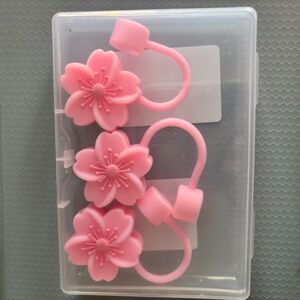 Set Of 3 Pink Flower Silicone Straw Drink Toppers w/ Case Stocking Stuffer