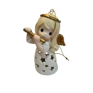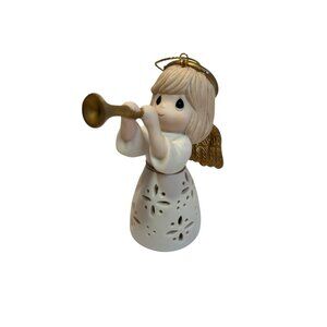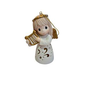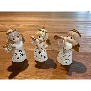 These Precious Moments angel ornaments feature intricate gold accents, delicate cutout patterns, and charming musical poses. Ideal for holiday decor or collectibles.