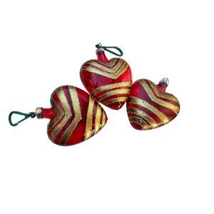 Set Of 3 Red & Gold Heart-Shaped Christmas Tree Ornaments With Glitter Stripes