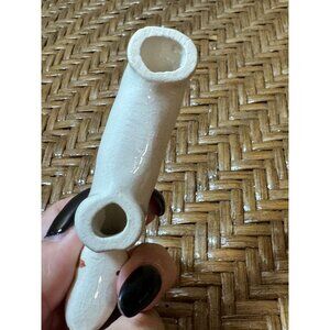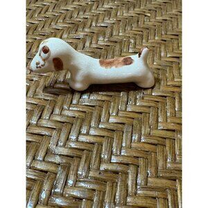 These delicate ceramic dog figurines feature unique designs with a vintage appeal, showcasing white bodies adorned with brown and yellow spots.