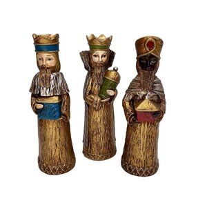 These vintage figurines from Schmid Bros bring a touch of historical reverence to your holiday decor. Crafted in Japan, the set represents the Three Wise Men, each carrying distinct gifts. Their intricate detailing and gold finish evoke a timeless elegance, making them an exquisite addition to your Christmas collection.