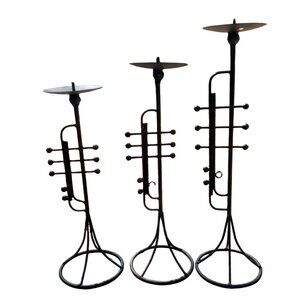 This set of three vintage trumpet-shaped candle holders offers a unique charm to any decor. Crafted from durable black metal, their musical instrument design adds a touch of nostalgia. Perfect for creating a warm ambiance, these holders can accommodate standard-sized candles, making them a versatile addition to any setting.