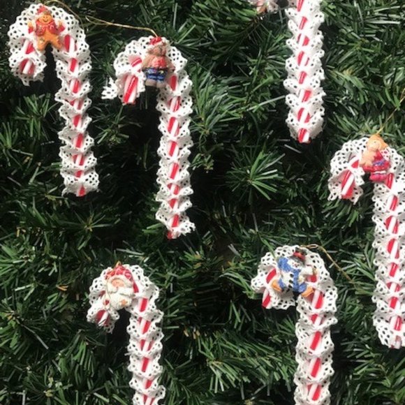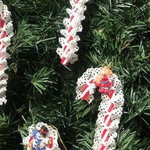 These fun acrylic candy canes are a fun idea. Candy Canes are wrapped in a white lace with a small decoration hot glued at the top. This is a perfect set of ornaments for your Holiday Tree or used for a decoration piece on a gift package. Caution always as it has a small part on the candy cane that could be of choking hazard to small children.