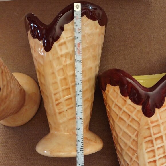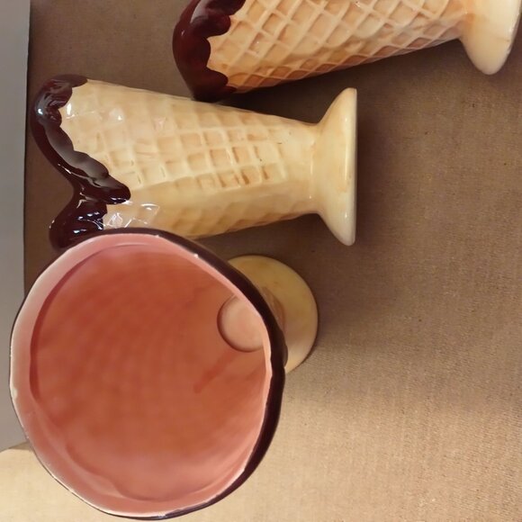 Set Of 4 Ceramic Ice Cream Cone Dessert Cups With Multicolor Interiors-LIKE NEW