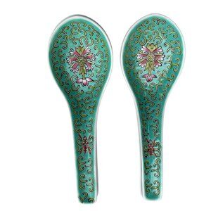 Set Of 4 Chinese Porcelain Soup Spoons With Floral Design In Green & Pink