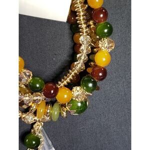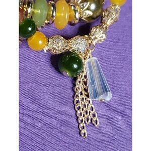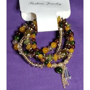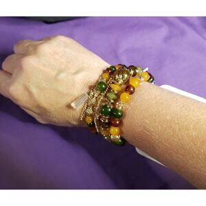 Set Of 4 Glass Bead Stackable Bracelets Multicolored Beads & Gold Tone Metal NEW. This is a set of 4 glass bead stretch bracelets. They have gorgeous smooth round yellow, green, brownish-orange, and faceted champagne colored glass beads, along with some gold tone metal beads. There is one tassel with a clear glass crystal, a green bead, and some gold tone metal chains. These are stackable so you can wear them all or separate. It was hard to get a size since they are still in the packaging, but I wear a 6.5 and they were a little loose on me, so I'm thinking about a 7 inch at the smallest. They do stretch so they will fit most. These are new in the original package.
