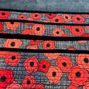 Set Of 4 quilted placemats w/ stacked red and orange poppy flowers on grey background. Adds a touch of color to your dining setup.