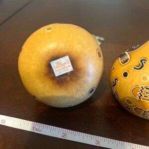 These exquisite gourd ornaments from Lucuma Designs showcase intricate gingerbread and bird motifs. Handcrafted with precision, they add a touch of elegance to any decor setting.