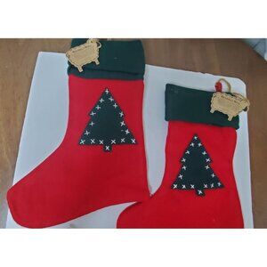 Once upon a festive winter's eve, these charming Christmas stockings adorned with a whimsical tree design awaited to be filled with delightful surprises. Crafted from naturally warm wool, their vibrant red body and contrasting green cuffs brought cheer to mantels across the land, spreading joy with every holiday season.