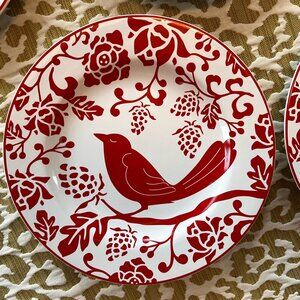 Set Of 4 Pier 1 Bird & Floral Red/White Stoneware Salad Plates Boho Excellent UC