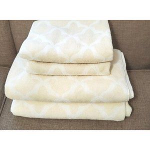 Elevate your bathroom experience with this set of four Pottery Barn Marlo Jacquard bath and hand towels. Made of 100% organic cotton, these towels are not only luxurious but also eco-friendly. The beautiful yellow color and Marlo pattern add a touch of elegance to your bathroom decor.