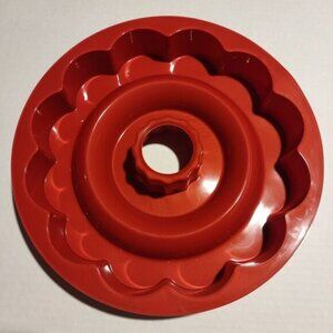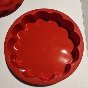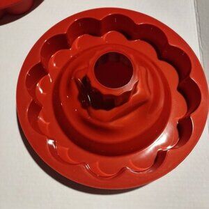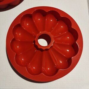 Durable and flexible red silicone molds for bundt cakes, providing multiple design options for creative baking projects and easy non-stick release. NEW