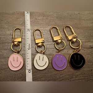 Brighten your day with this charming set of smiley keychains. Featuring gold hardware and colorful smiley faces in pink, black, white, and purple, these accessories add a playful touch to any bag or set of keys.