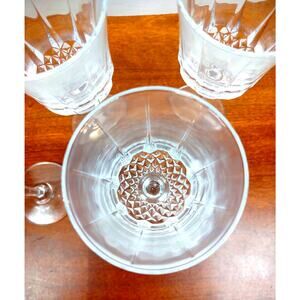 This elegant set of 4 Vintage St George Glendale Water Goblets are beautifully designed with a diamond cut pattern at the bottom of the bowl with vertical cuts circling. The stem is multi faceted.
