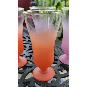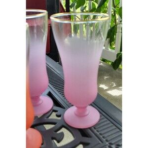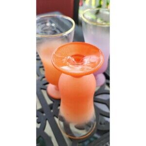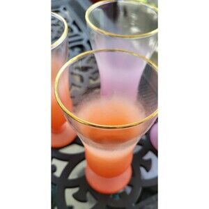 This set of 4 vintage frosted Blendo glass drink parfait glasses in purple and orange is a perfect addition to any collection. Made in the United States in the 1940s-1960s, these Mid-Century Modern glasses feature a matte finish with a gold rim, adding a touch of elegance to your drinkware. With a height of 6 inches and a diameter of 2.75 inches, these original Blendo glasses are ideal for all occasions and can be hand washed for easy maintenance. Perfect for those who appreciate the charm and style of vintage drinkware.