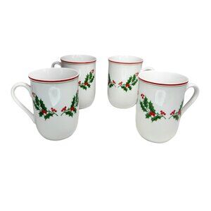 Set Of 4 Vintage Holly Berry Red & Green Trim Christmas Mugs Fine Porcelain