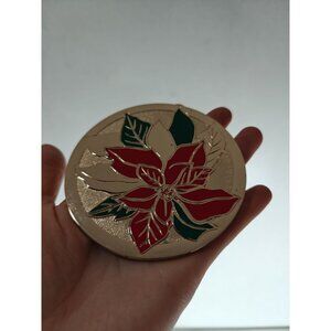 Set Of 4 Vintage Japan Brass Enamel Poinsettia Coasters 4" Velvet Back Christmas