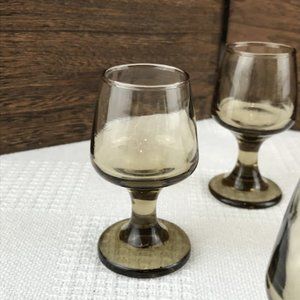 Set Of 4 Vtg Libbey Shot Glasses Tawny Accents in Smoky Brown. This vintage barware set has a sturdy pedestal bottom with a smokey brown color and a translucent thinner glass rounded square bowl.