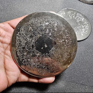 Set Of 5 Silver Plated Ornate Engraved Round Coasters they show signs of wear such as scratches and tarnishing see pictures for reference