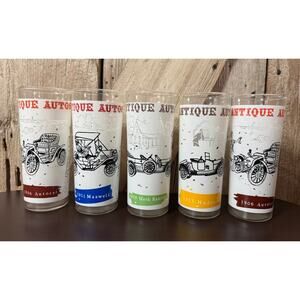 Set Of 5 Tall Classic Car Collectible Antique Autos Drinking Glasses Water Cups
