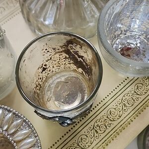decorative votive has glitter, beading and brass tone accents, all few little beads missing & some mercury wash off, but I don't think anyone will notice due to how pretty it is with the glow of this set