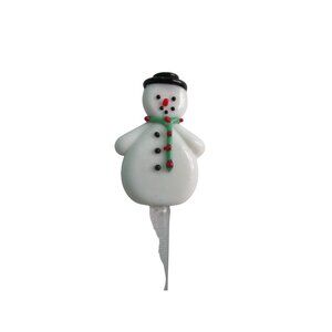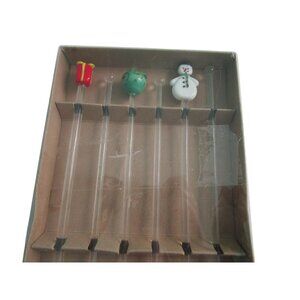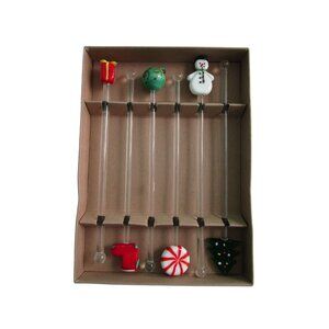 This set of six hand-blown glass swizzle sticks showcases festive Christmas designs, including a snowman, peppermint, and gift. Each stick adds a touch of elegance to holiday gatherings, making them a unique addition to your festive barware collection. Perfect for enhancing the visual appeal of your cocktails. Clear swizzle are different thickness and length. Package shows wear and tear. No chips or cracks. May be gently used