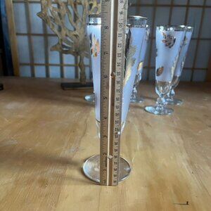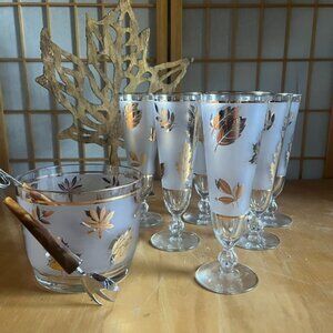 This elegant set of pilsner glasses showcases a frosted glass finish adorned with gold autumn leaf patterns. Ideal for seasonal entertaining, these glasses blend sophisticated design with functionality, adding a touch of elegance to any collection. The vintage style and intricate detailing make them a timeless choice for those who appreciate classic glassware.