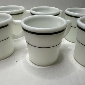 Set Of 6 Vintage PYREX Milk Glass Mugs Green Double Banded Coffee Cups Stripes