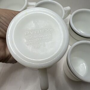 This set of 6 vintage PYREX milk glass mugs features a classic green double banded design with stripes. Made in the United States, these cups are a charming addition to any collection of dinnerware and serveware. The set includes 3 pieces, each crafted from milk glass in a timeless white color. Perfect for coffee or tea, these vintage PYREX mugs offer a touch of nostalgia and retro charm to any kitchen or dining room.
