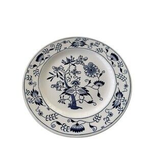 Beautiful Royal China Blue Onion dinner plates, featuring the classic cobalt blue floral onion pattern on bright white ironstone. Made in the USA, these sturdy and timeless plates bring traditional elegance to any table setting.