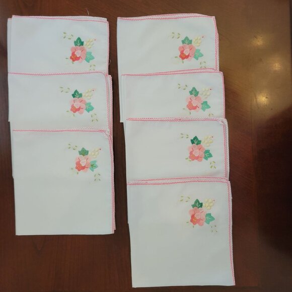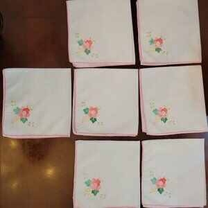 Set Of 7 Vintage Floral Embroidered Cotton Napkins With Pink Trim