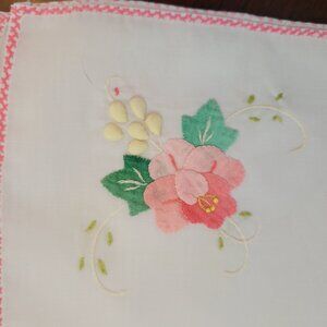 These vintage napkins feature charming floral embroidery on a soft cotton fabric. The pink trim adds a touch of elegance, ideal for enhancing table settings with a classic flair. Ideal for gatherings, they boast a timeless appeal and are a practical addition to any dining experience.