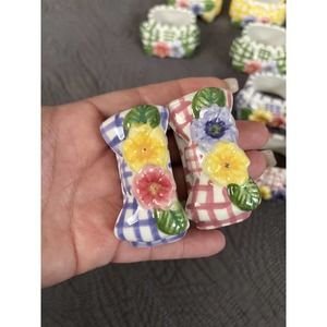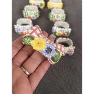 Set Of 8 Ceramic Floral Napkin Rings Bow Plaid By Lady Jayne NWOT