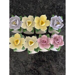 Set Of 8 Diamantine China Floral Napkin Rings Pink Roses & Yellow Daffodils