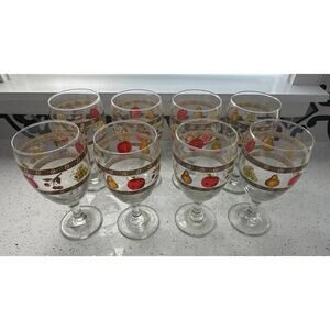 Add a touch of vintage charm to your table setting with this set of 8 Country Orchard goblets by Block. Each goblet holds 12 ounces and features a delightful fruit design. Perfect for water or wine, these glasses are sure to impress your guests. They appear to be in excellent condition, with no chips, cracks, or cloudiness. Each glass stands approximately 7 inches tall. Elevate your dining experience with these beautiful and unique goblets!